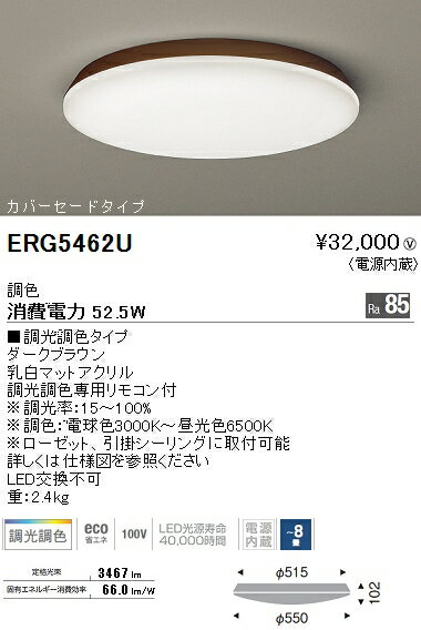 サイズ:φ550×102mm 重量:2.4kg 本体色:ダークブラウン、乳白マットアクリル 電圧:100V 消費電力:52.5W 光源色:電球色3000K〜昼光色6500K 定格光束:3467lm 演色性:Ra85 光源寿命:40000時間 備考:調光調色専用リモコン付、ローゼット・引掛けシーリング対応 取付について:ローゼット・引掛シーリングに取付可能。