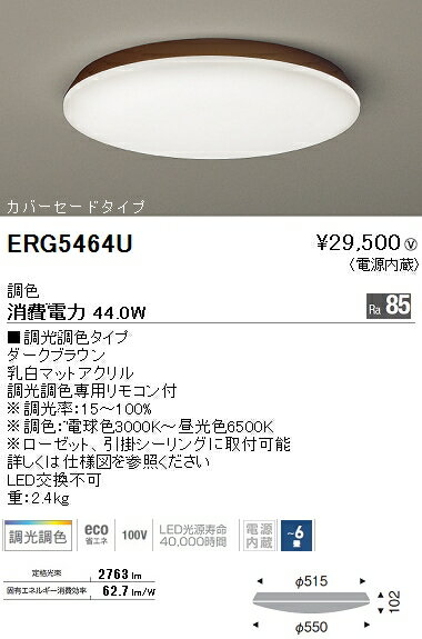 サイズ:φ550×102mm 重量:2.4kg 本体色:ダークブラウン、乳白マットアクリル 電圧:100V 消費電力:44.0W 光源色:電球色3000K〜昼光色6500K 定格光束:2763lm 演色性:Ra85 光源寿命:40000時間 備考:調光調色専用リモコン付、ローゼット・引掛けシーリング対応 取付について:ローゼット・引掛シーリングに取付可能。