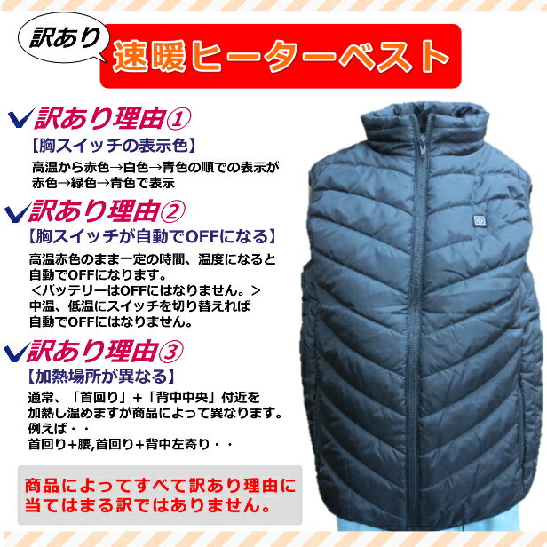 3段階温度調整可能 ヒーター内蔵ベスト 【訳あり商品での販売】 訳あり理由1)胸スイッチの表示色 訳あり理由2)胸スイッチが自動でOFFになる 訳あり理由3)加熱場所が異なる 商品によって訳あり理由が異なります。